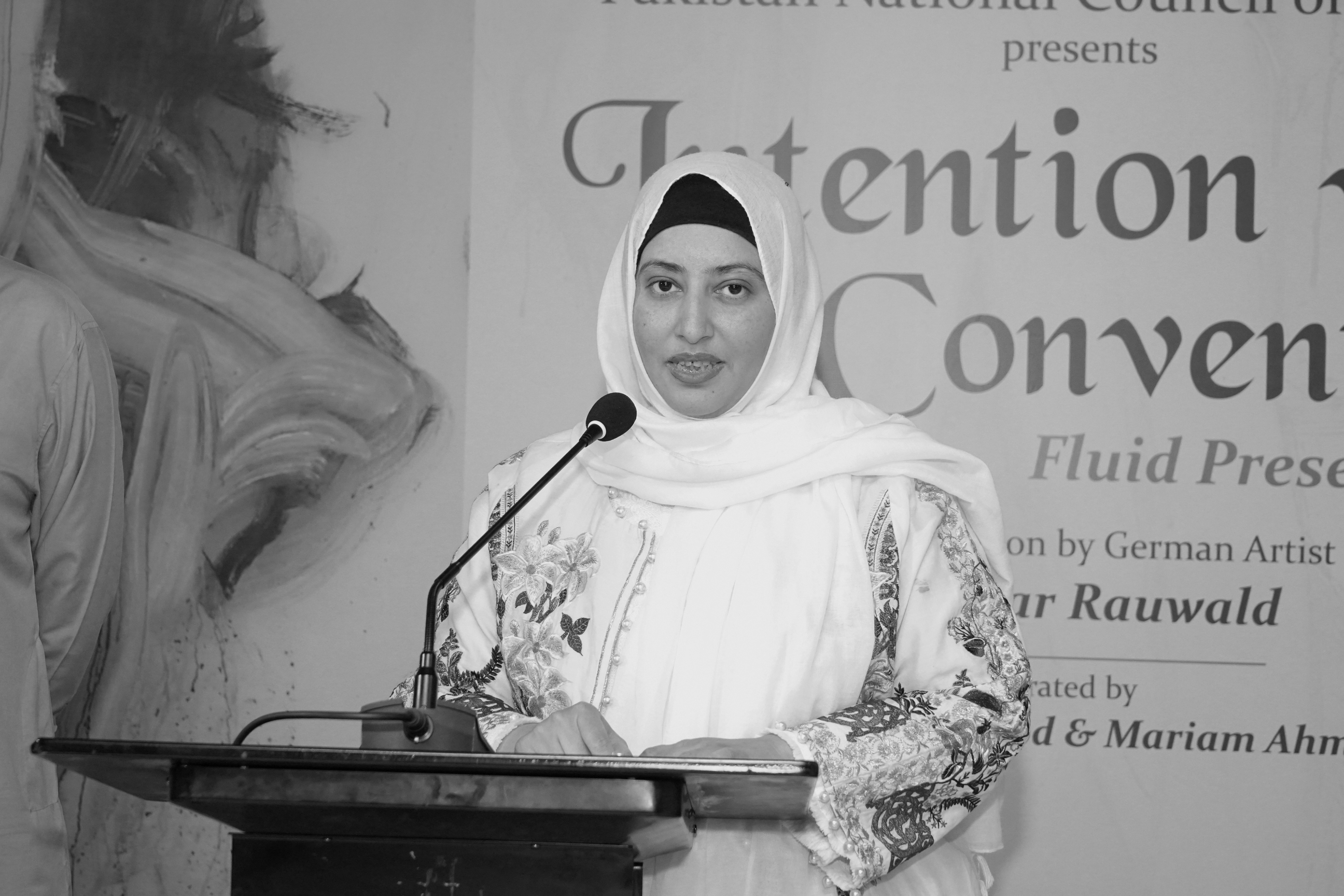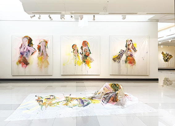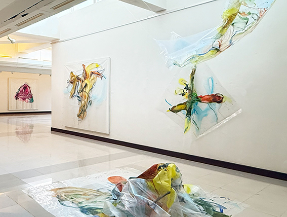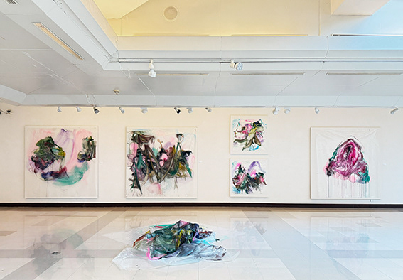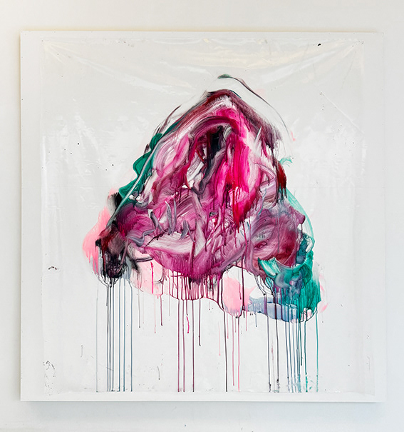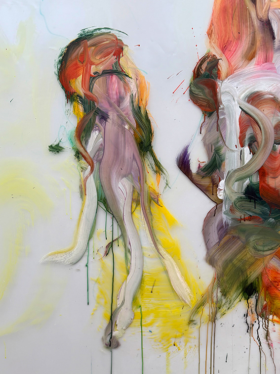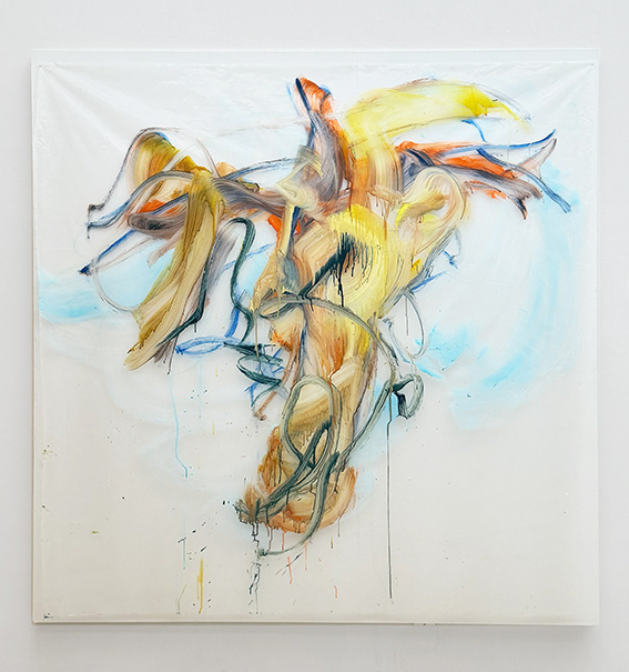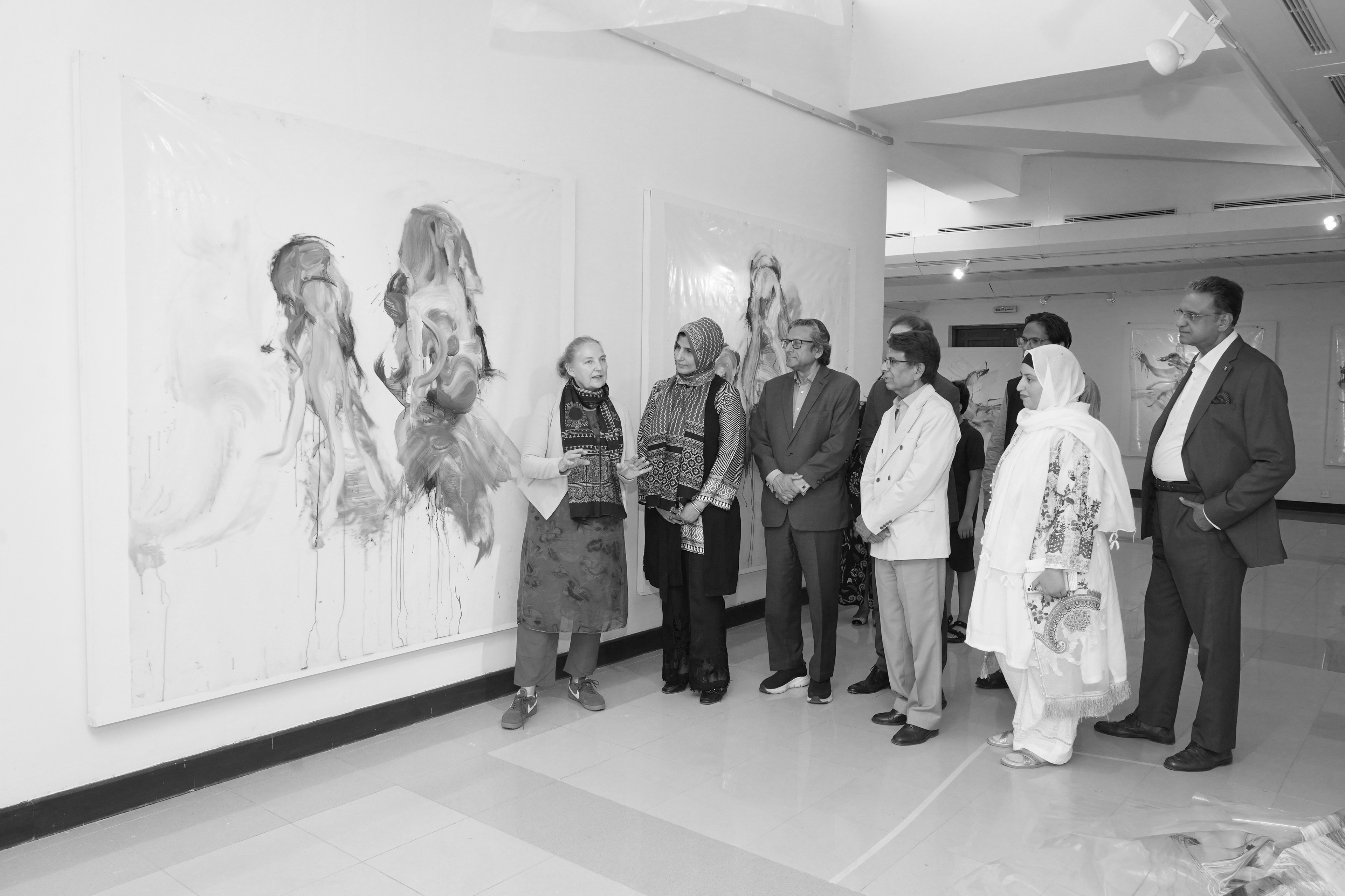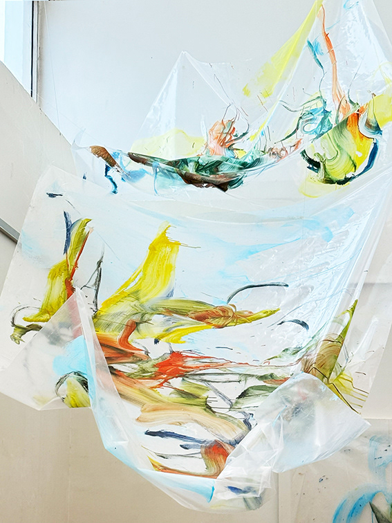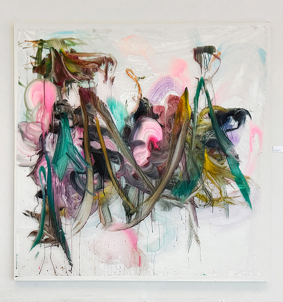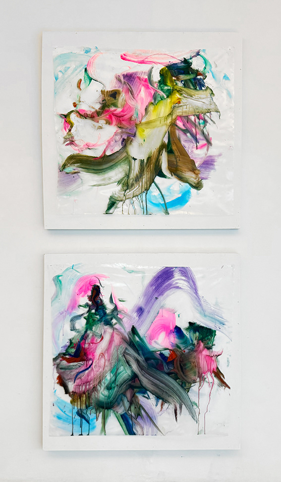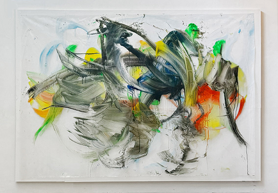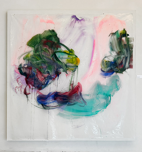 The paintings in the exhibition are created on transparent surfaces. Dagmar Rauwald views the transparent medium as a hybrid interface, a kind of platform where she reflects real-world events through painterly gestures. These works become visual reports within the context of evolving codes in the digital age. Her interest in color codes arises from observations of our hybrid world, where the use of colors has long since become a widespread verbal communication strategy. Patterns conhas long since become a widespread verbal communication strategy. Patterns condense in series of images into dynamic compositions, through which she finds a personal approach to unfamiliar and complex interconnections. personal approach to unfamiliar and complex interconnections. Her painterly expression intertwines intention and conventional perspectives, drawHer painterly expression intertwines intention and conventional perspectives, drawing on the theory of philosopher John Searle. Like art, language derives its meaning from the speaker’s intentions within a societal framework. This interplay is compafrom the speaker’s intentions within a societal framework. This interplay is comparable to Rauwald’s abstract-associative art, in which visual elements encourage interpretation. interpretation. Rauwald’s works emphasize intuitive processes and the authenticity of the present moment. They foreground personal intentions while simultaneously reflecting on conventions and norms. Her dynamic visual language evokes the fluidity and rhythconventions and norms. Her dynamic visual language evokes the fluidity and rhythmic structure of Urdu calligraphy, which merges script and art in its aesthetics and meaning. Similarly, Rauwald’s paintings create a multilayered hermeneutic depth, where form and content share a symbiotic relationship. where form and content share a symbiotic relationship. The interplay between artistic intention and individual reception generates a tension that situationally and contextually enables a form of “concrete understanding.” In this way, the artist’s intuitive intentions and the viewer’s subjective interpretations merge into an open dialogue, offering new perspectives on the perception of “descriptions.” merge into an open dialogue, offering new perspectives on the perception of “descriptions.” This dialogue reflects a cultural exchange: Western-influenced painting meets the visual power of calligraphy. The connection establishes a new level where Western and Eastern traditions converge. Thus, the painterly expression blends cultural narand Eastern traditions converge. Thus, the painterly expression blends cultural narratives, hinting at a transcultural understanding. ratives, hinting at a transcultural understanding. The focus on a quasi-language and the movement toward verbalization also mirThe focus on a quasi-language and the movement toward verbalization also mirrors a current international trend: In times of unrest and looming dangers, there is a heightened search for certainties. Ultimately, the artist finds her certainty in the autonomy of the artistic gesture.